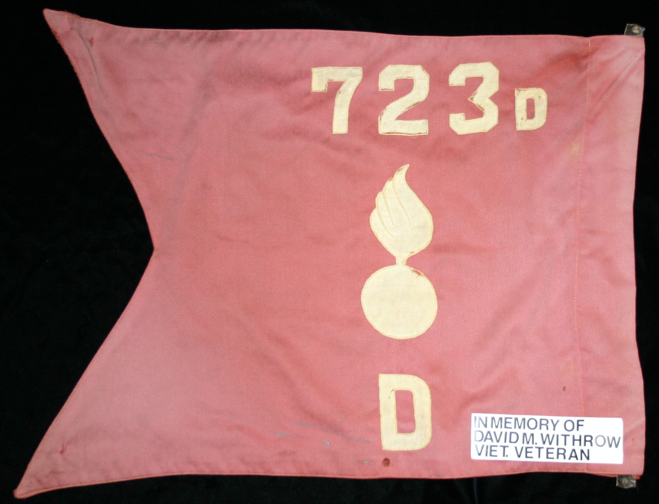 Red banner with yellow lettering: 723 D. Attached note says: In Memory of David M. Withrow, Viet. Veteran.