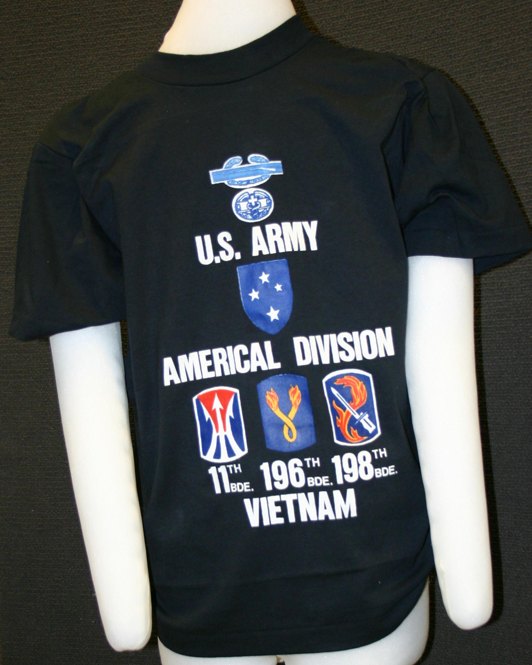 Americal Division t-shirt. Includes Americal Division insignia, as well as 11th, 196th and 198th brigade insignia.