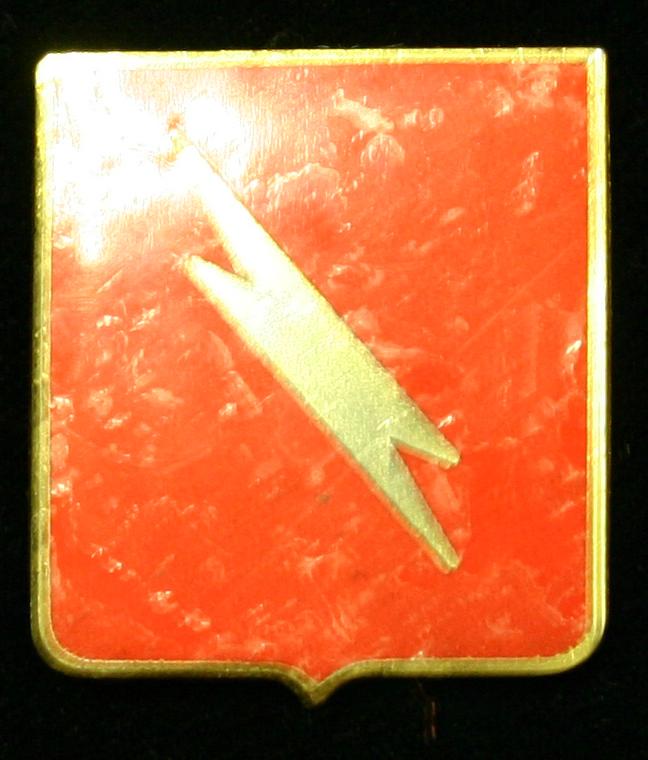1st Battalion, 73rd Brigade Field Artillery crest. Gold lightning bolt on a red crest.