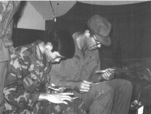 28A Lieutenant just in from long range patrol, 'Thousand Yard Stare.' Before the squad came to the medical aid station, an officer told me a squad would be arriving. I was instructed to provide medical care but not ask where they had been. I had only a vague concept of where we were, just the deep boonies. I treated men all the time who had been out in the jungle. If I had asked where they had been, the answer would have been, 'We were out on Hill 260,' which meant nothing to me. As soon as the officer told me not to ask, I knew immediately the squad had been in Laos. The squad belong to SOG [Studies and Observation Group] MACV