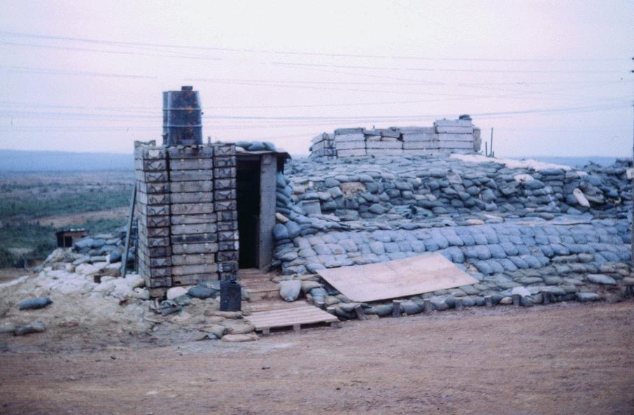 Right [east] side of battalion aid station, 1/77 Armored Battalion, 1/5 Infantry Brigade [Mechanized], at Charlie 2, between village at Cam Lo and Alpha 4 [Con Thien], Quang Tri Province, South Vietnam. The aid station was on the north side of Charlie 2, near north gate for road to Alpha 4. The east entrance is behind medical platoon jeep. To the right of the jeep is the medical platoon ambulance and personnel carrier. [NOTE: 1/77 Armored Battalion was stationed at Charlie 2 from 01 December 1969 to mid-January 1970. My slides printed April 1970 depict the aid station after it was remodeled and reinforced with concrete roof and additional above ground timber walls.] Kodak Instamatic camera, Kodachrome slide developed by Kodak, stamped on slide mount in red ink: Dec69P9 number 11. Digital color photograph from slide printed February 2004. Photographer: Capt. James B. [Jim] Evans, Army Medical Corps, 1/77 Armored Battalion, 1/5 Infantry Brigade [Mechanized]. Battalion surgeon from November 1969 to early June 1970.