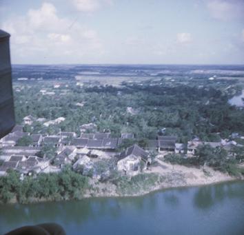 Aerial Views Cua Viet and flight along Quang Tri River to Mai Loc Aerial views from helicopter during flight with 1/77 Armored Battalion commander, Lt. Col. Miller. Mai Loc was a Special Forces and Montagnard Camp in the mountains in western Quang Tri Province. Mai Loc was located in a very greeny valley surrounded by concertina and mine fields. I was acutely aware during this flight that I had no jungle survival training, no concept of where we were flying and no idea how to attempt to survive if we crashed in these mountains. The Army provided no jungle survival training for physicians; during this period the Army's intention was dumping as many physicians into Vietnam as quickly as possible. The Army in its infinite stupidity assumed we could practice medicine anywhere but had no concern about providing jungle survival skills or what to do if the helicopter crashed, a relatively common occurrence. Aerial View village Quang Tri Province