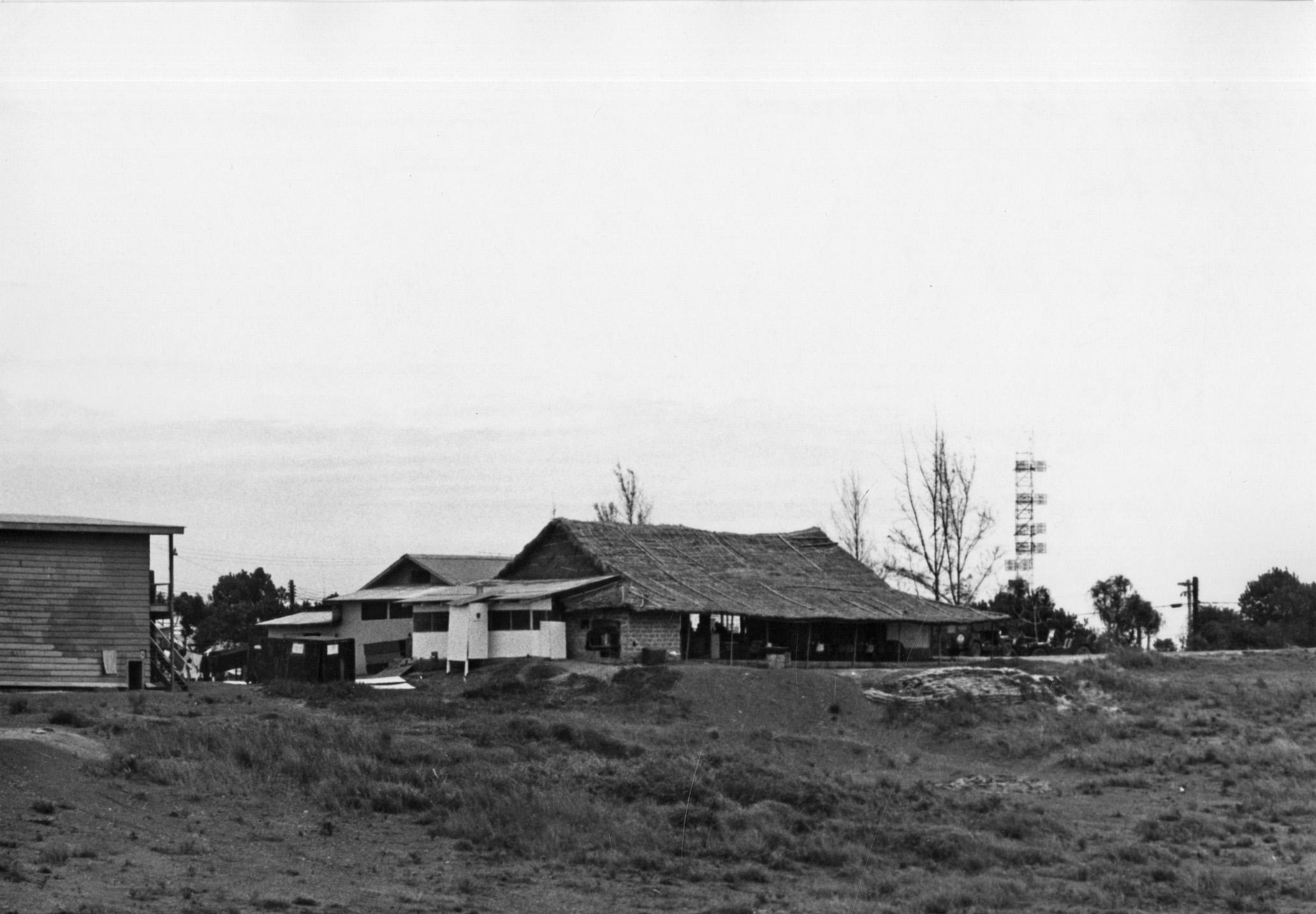 Officers Club for Americal Division, Chu Lai, Vietnam. Building had a thatched roof with Hawaiian Luau interior decor. View from 91st Evacuation Hospital.