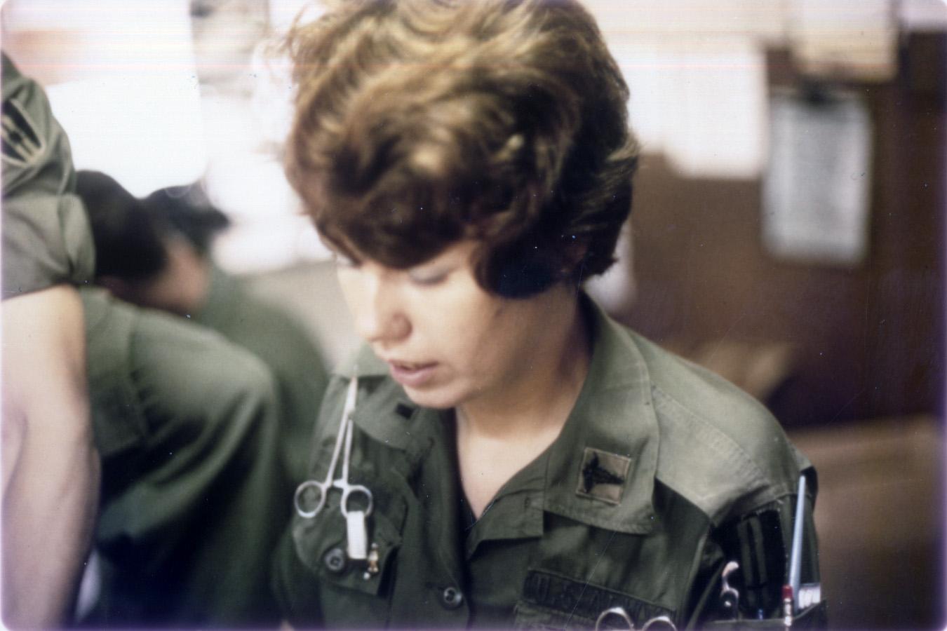 1st Lieutenant Cheri Hawes, US Army Nurse Corps, at desk for Emergency Room, 91st Evacuation Hospital, Chu Lai, Vietnam.