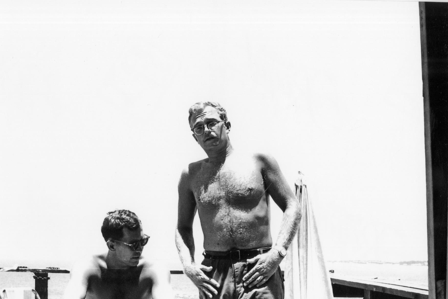 Captain Dr. Steve Morse, junior radiologist at 91st Evacuation Hospital, Chu Lai, Vietnam, on deck of Boys Camp. Man on left is Dr. Paul Rodzewicz.