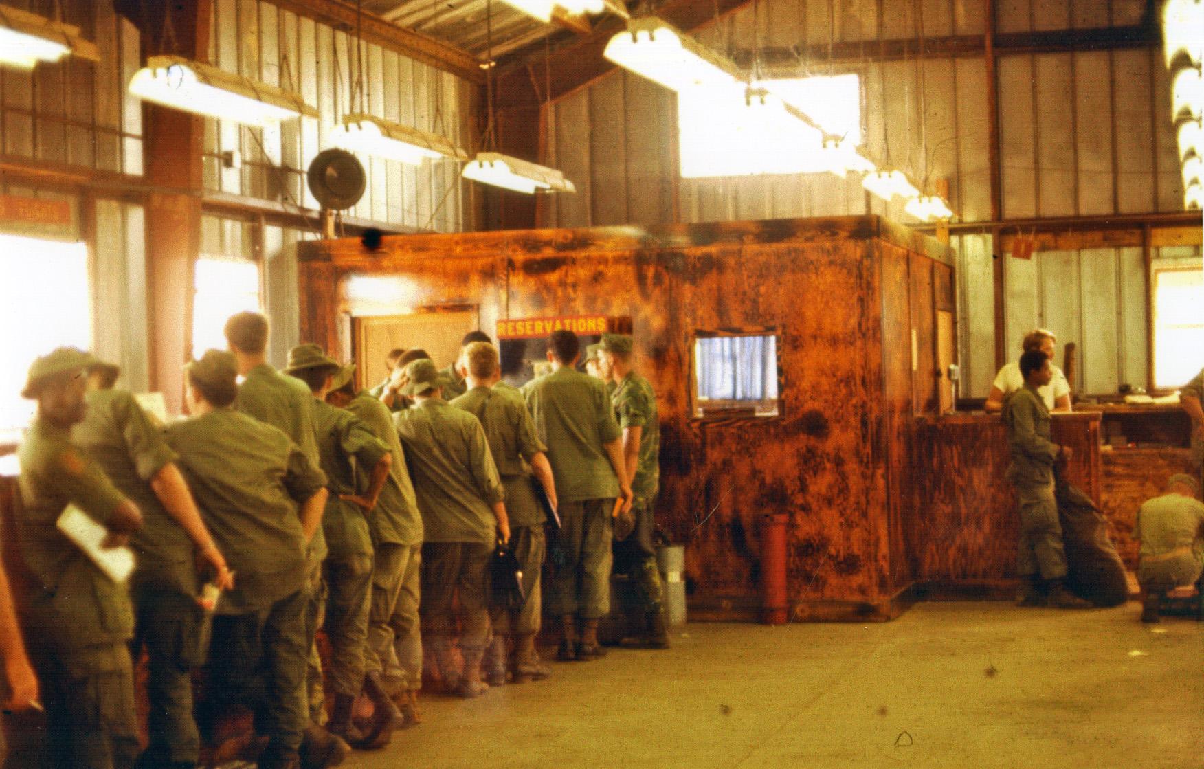 Interior, Chu Lai, South Vietnam Airport. Red sign, yellow letters: 'Reservations'