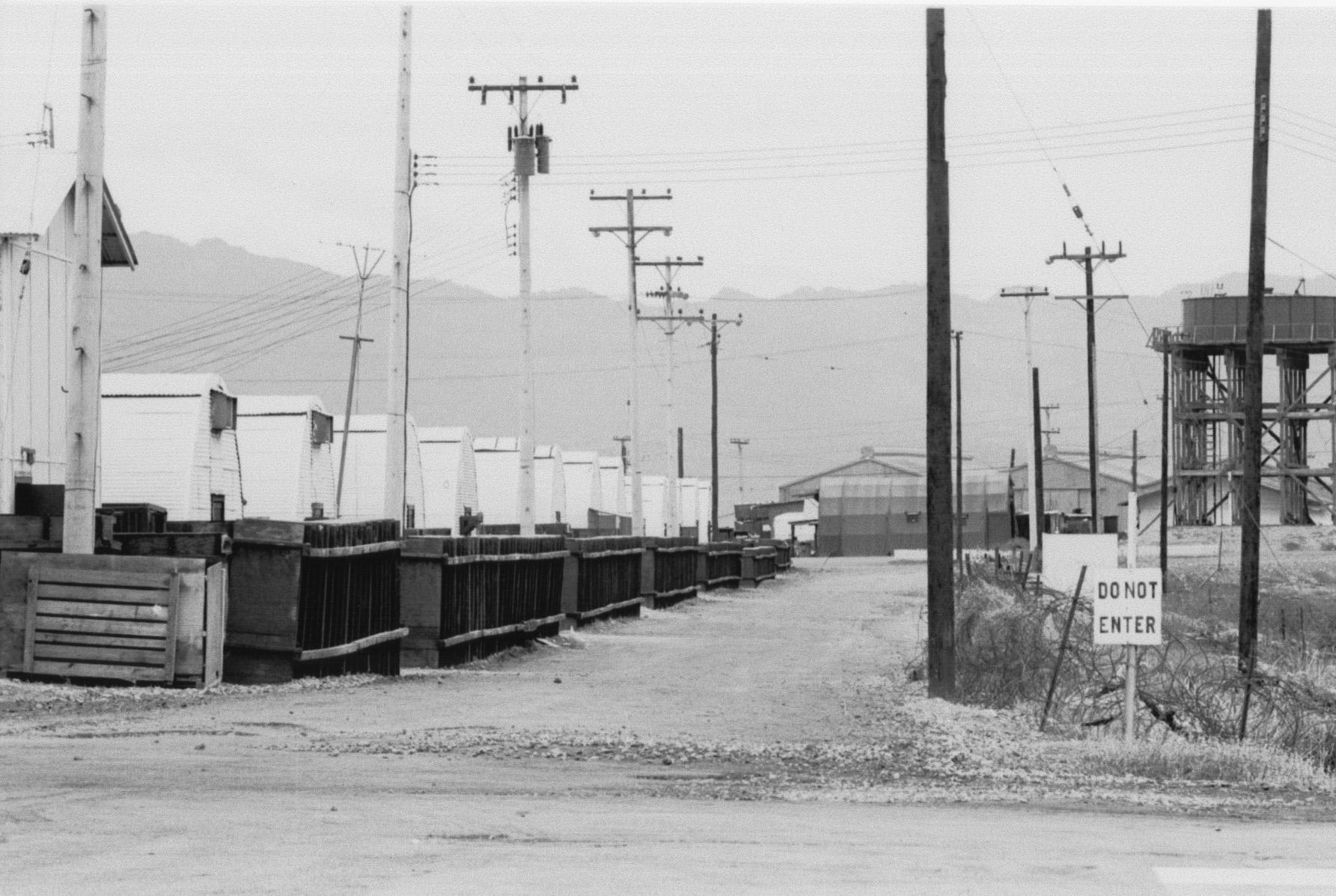 Backside of wards in Quonset huts, 91st Evacuation Hospital. Water tower on right. View toward west with mountains on horizon. Number 35A