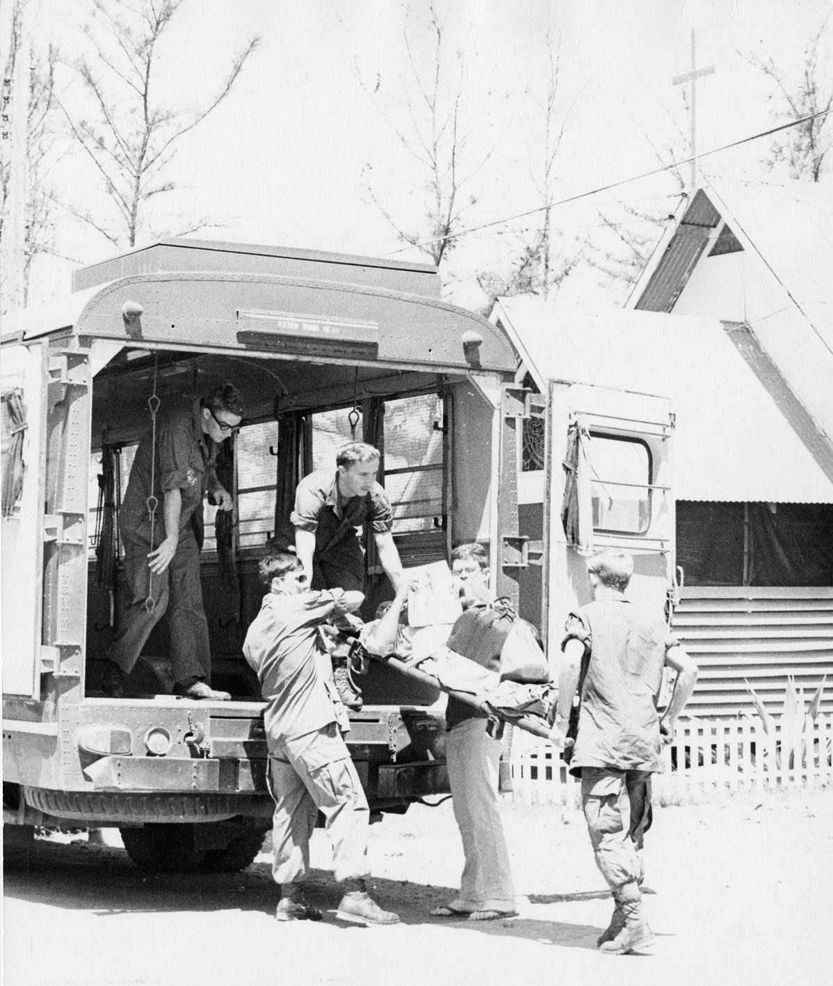 Transferring patients from 91st Evacuation Hospital onto bus. Building on right is chapel. Chu Lai, Vietnam. Photographer: James Evans