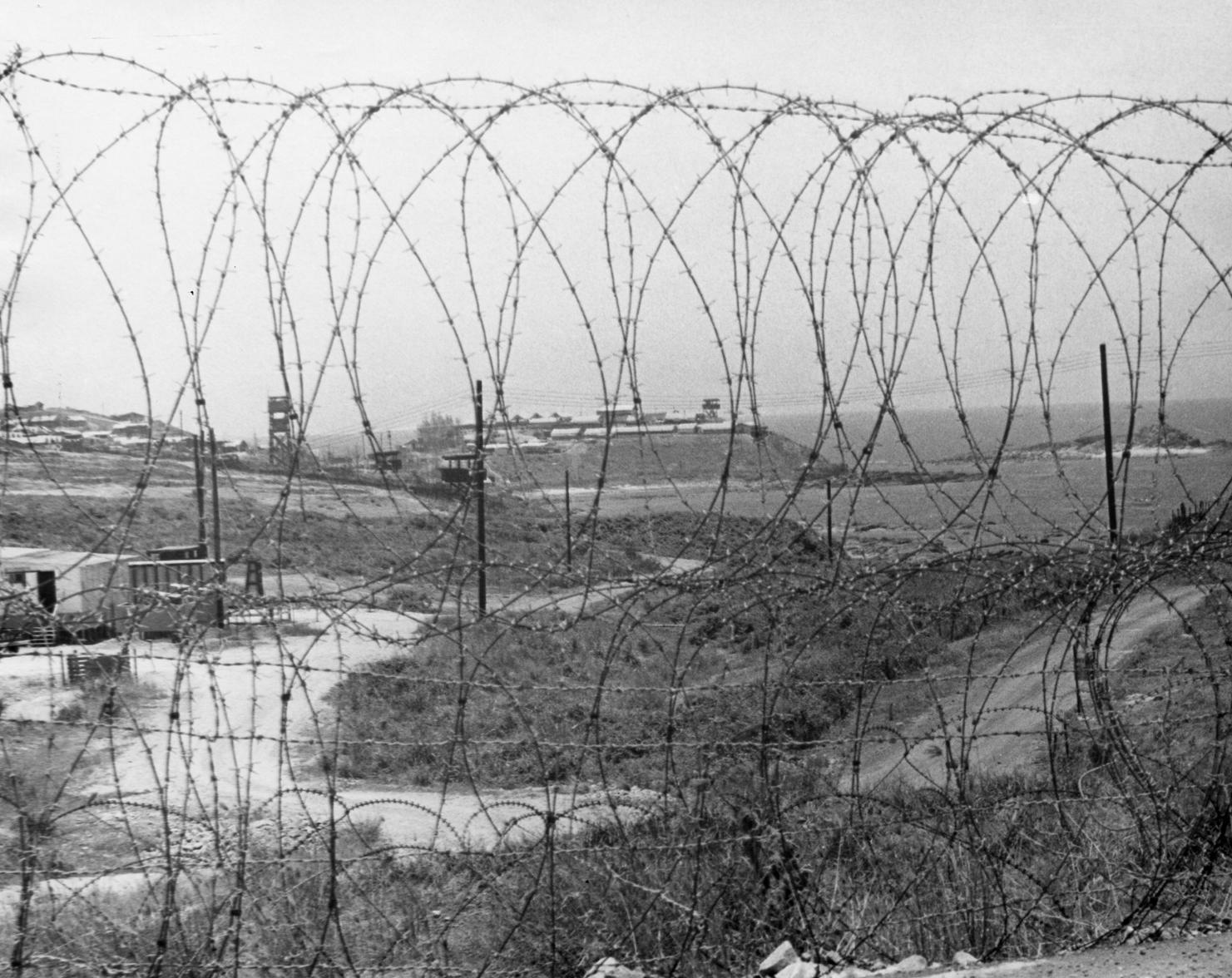View through concertina wire toward north from 91st Evacuation Hospital, near helicopter landing pad. Chut L, Vietnam.