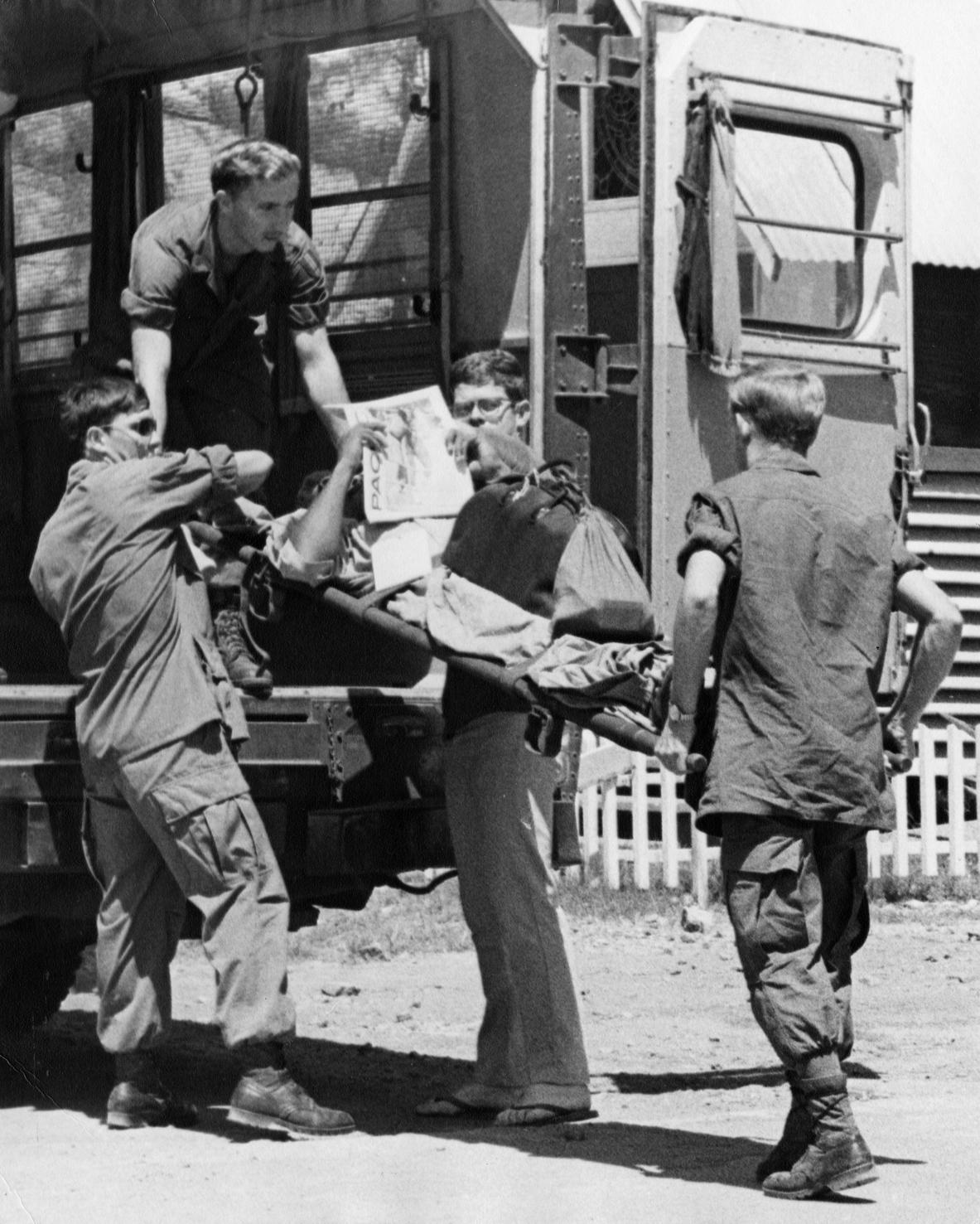 Unloading patients from medevac helicopter at 91st Evacuation Hospital Emergency room