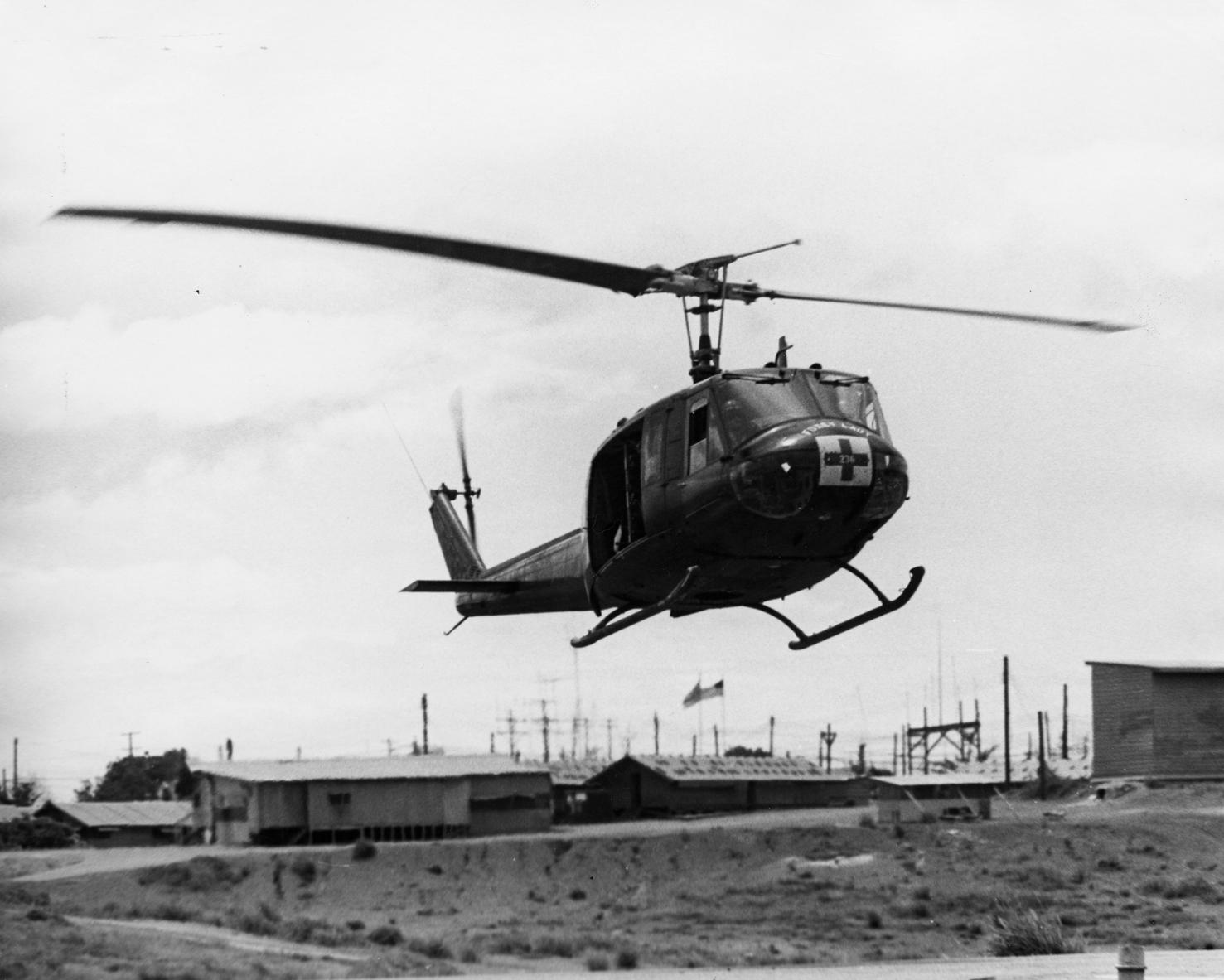 Medevac helicopter in for landing at 91st Evacuation Hospital Emergency Room.