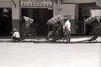 Rick shaws at entrance to 'Ferry to Jordan Road 3rd Class'