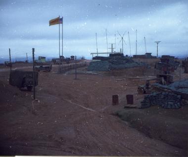 Bunkers and TOC [tactical operations center] with American flag, Charlie 2, Quang Tri Province, Vietnam.