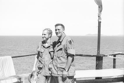 Boys Camp deck, 91st Evacuation Hospital, Chu Lai. Steve Morse, radiologist, on left, and Colonel Jack Tendler, right.
