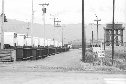 Backside of wards in Quonset huts, 91st Evacuation Hospital. Water tower on right. View toward west with mountains on horizon.
