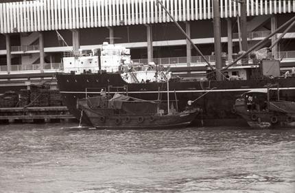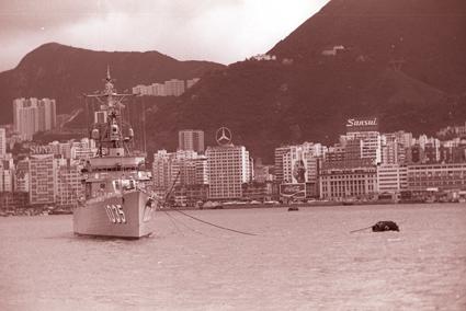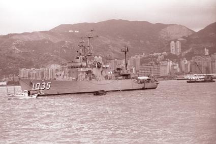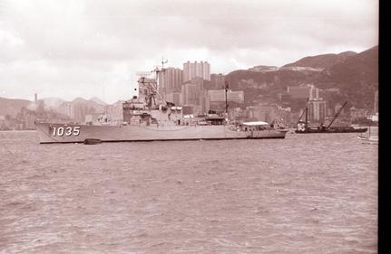 US Navy ship 1035, Victoria Island in background. Mercedes Benz sign on right.