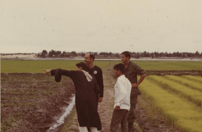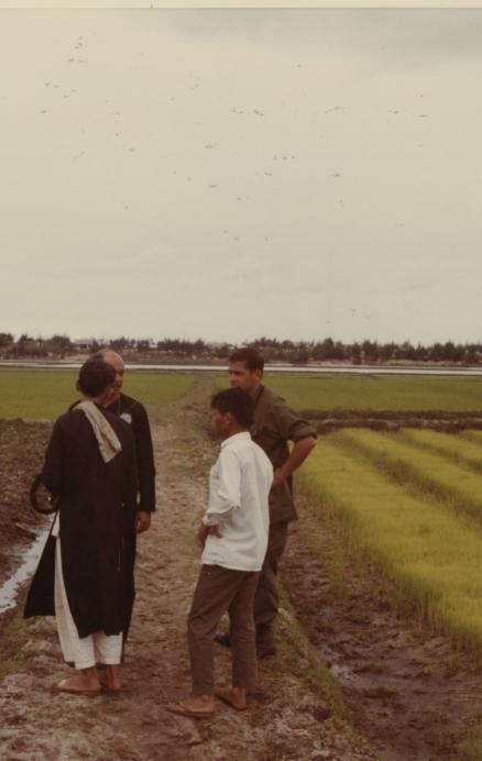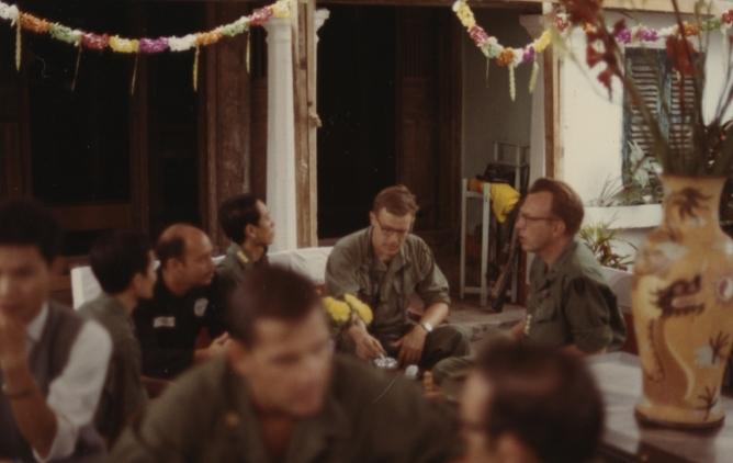 Major Jack Barnard, MD and Major Tom Hellwig, MD talking with Vietnamese at TET meeting in Tam Ky. Both were doctors at 91st Evac Hospital.