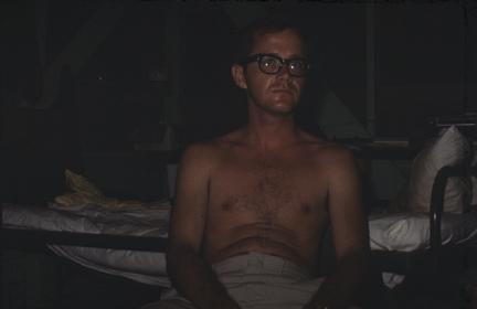 Jim B. Evans in room. My billet was adjacent to Boys Camp deck. Slide is severely underexposed. Unknown photographer.