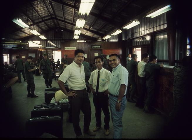 Bank employees saying goodbye to Romi Ramirez at Chu Lai air terminal. Romi was headed for the Philippines for R&R