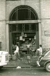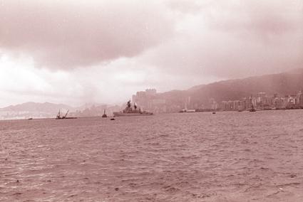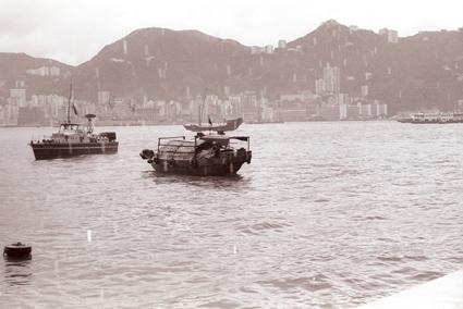 Chinese junks anchored below Kowloon wharf. Sign: Carlsberg beer and Texaco.