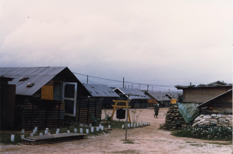 1/77 Battalion Aid Station on left. Yellow sign posted hours for sick call. On right battalion commander's hootch.