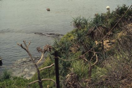Shoreline and reef, below 91st Evacuation Hospital Officers Club, Chu Lai. LRB [little round boat] in water.