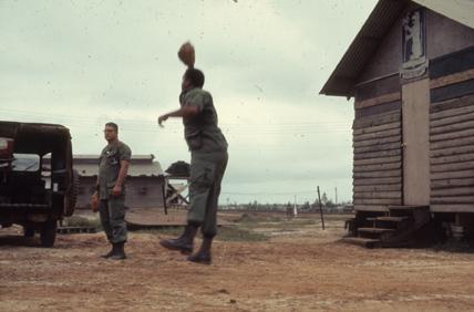 1/77 officers Dunklin, on left, and Williams. Building on right, 1/77 Armored Battalion Officers Club