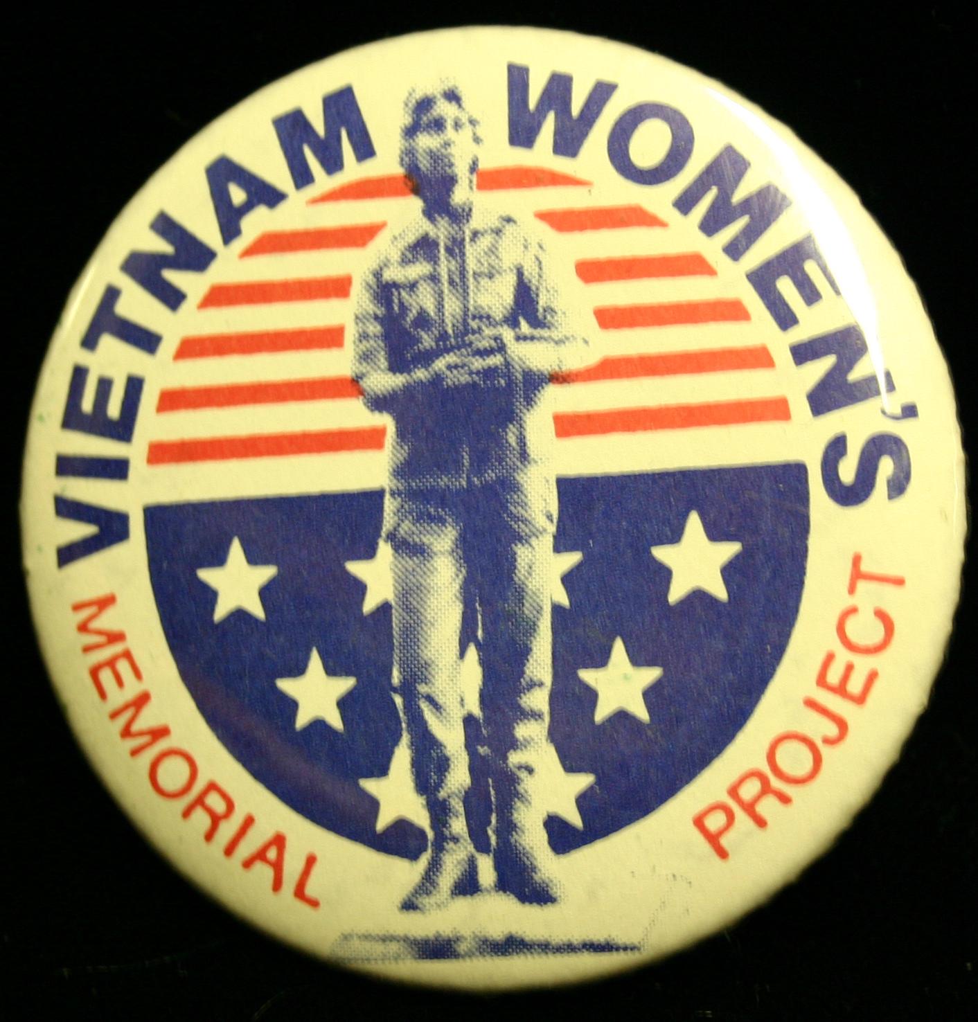 Button commemorating the Vietnam Women's Memorial Project. A photo knockout of a female soldier on a field of stars and stripes. Text surrounds the circular design.