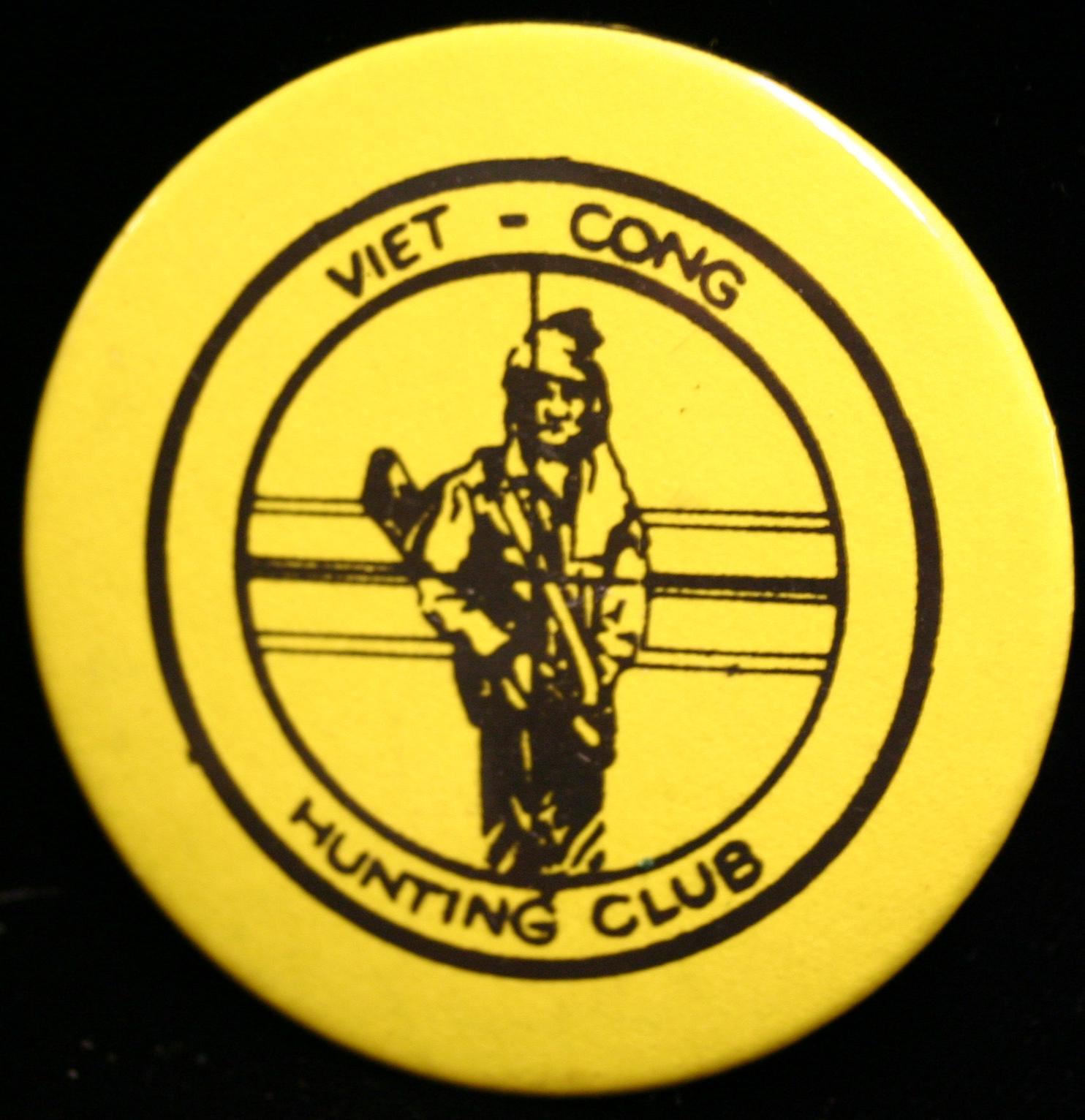 Yellow button with circular design depicting a shooting sight. A drawing of a Viet-Cong soldier stands in the crosshairs with the words VIET-CONG HUNTING CLUB above and below the circle.
