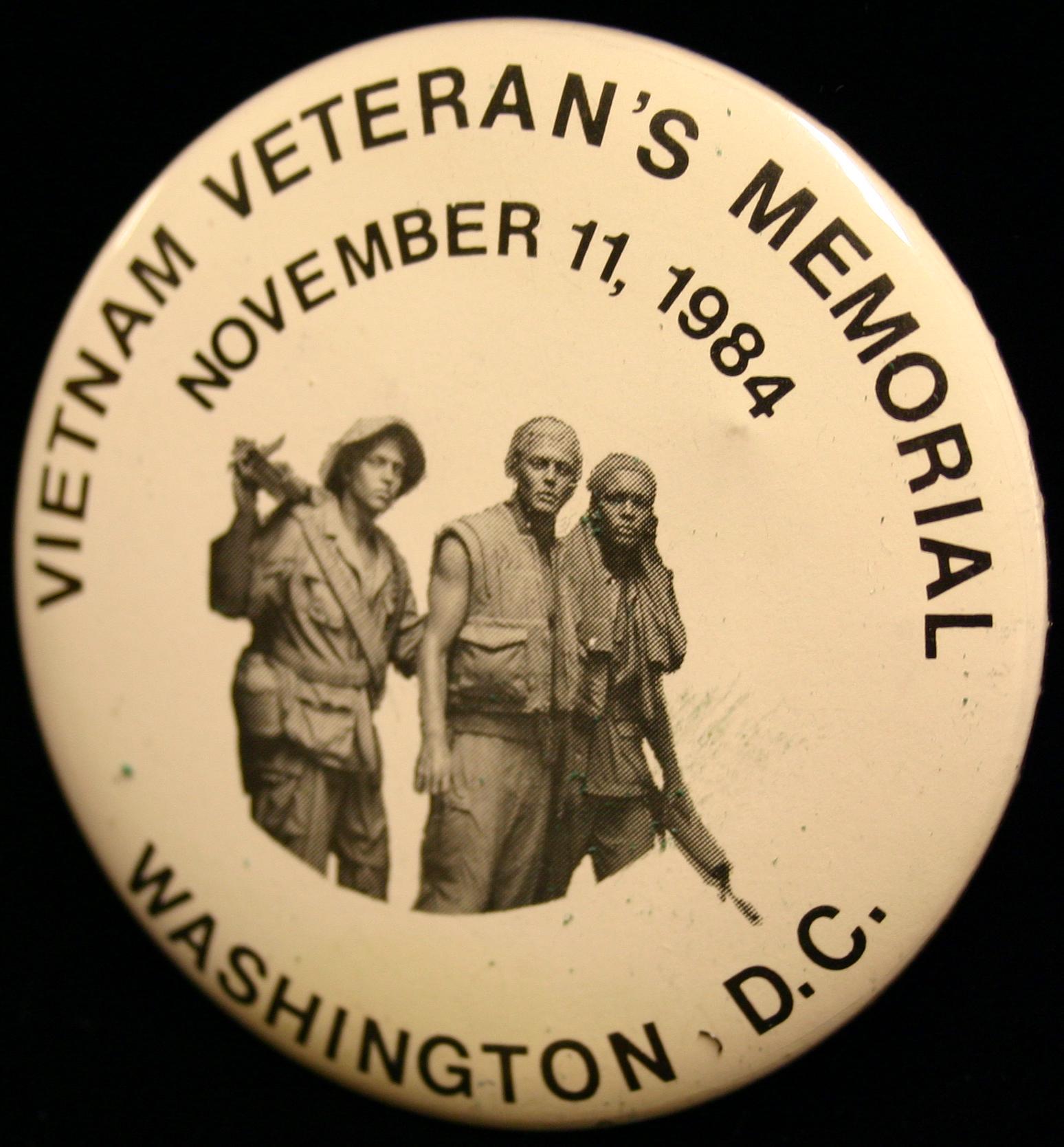 Button commemorating the Vietnam Veteran's Memorial in Washington, D.C. on November 11 1984. In the middle of the button is a photo of the memorial statue of three soldiers. Text surrounds the image.