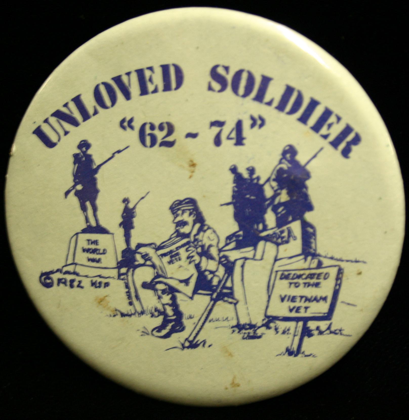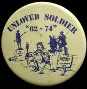 Cartoon button depicting a forgotten Vietnam veteran sitting among memorials of previous wars. UNLOVED SOLDIER, '62-74' is written above the cartoon.