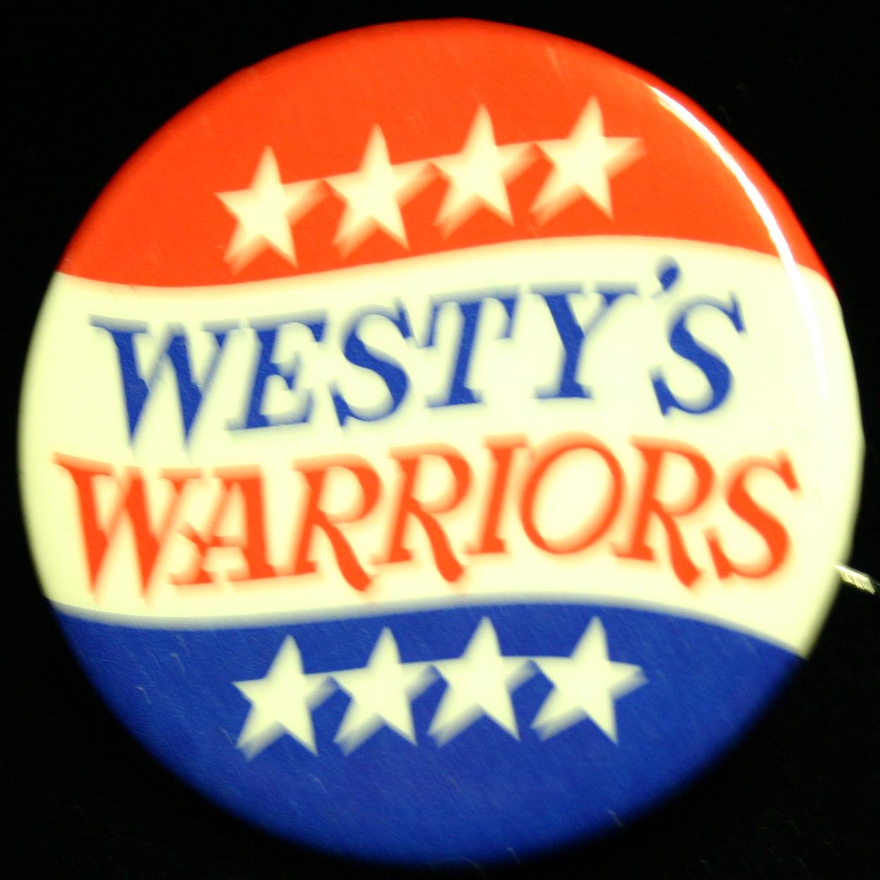 WESTY'S WARRIORS button. Red and blue text on a white banner with red and blue fields above and below containing white stars.