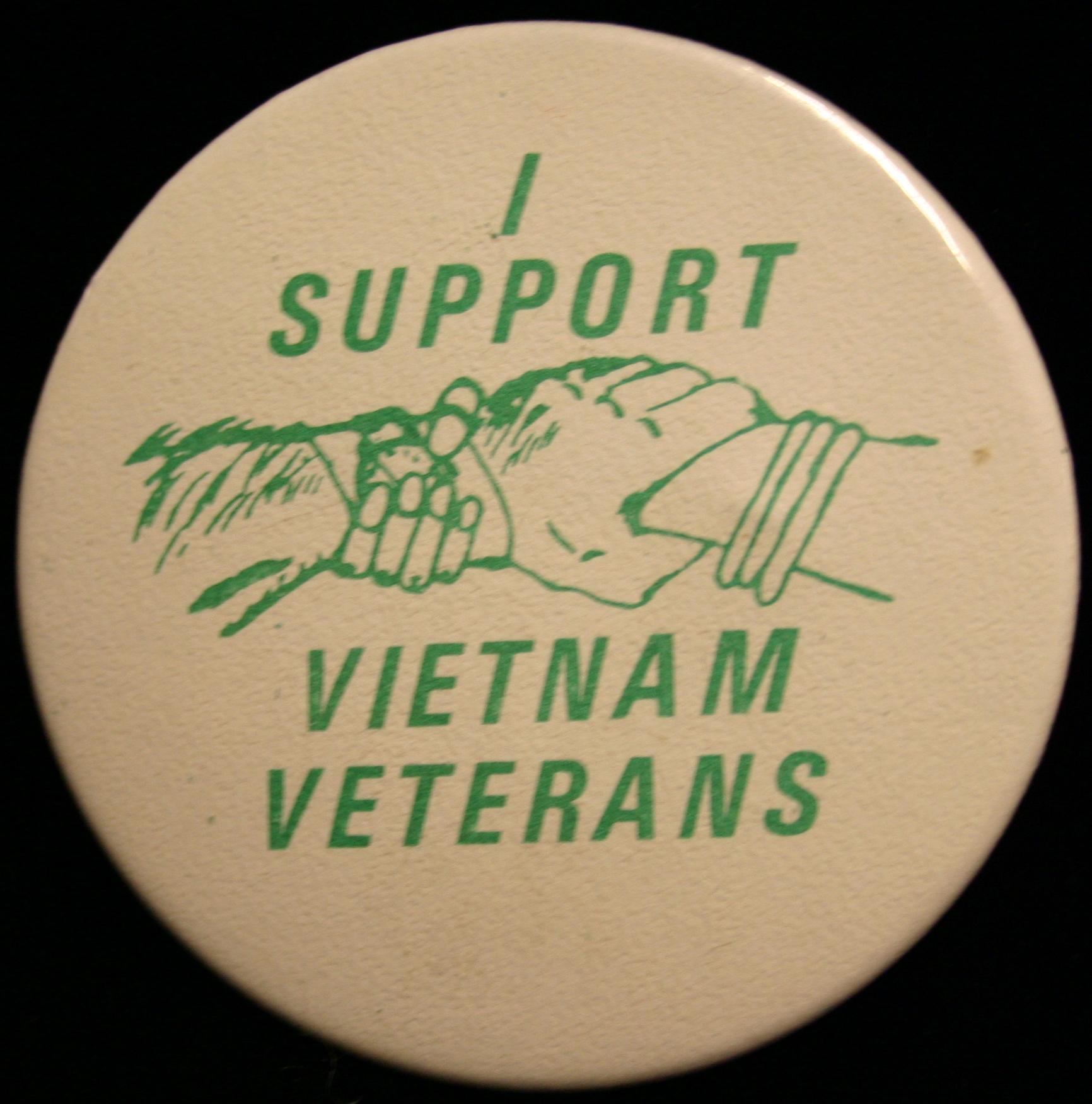 I SUPPORT VIETNAM VETERANS button. Green text and drawing on a white field. The drawing depicts two arms holding the other's wrist in an embrace.