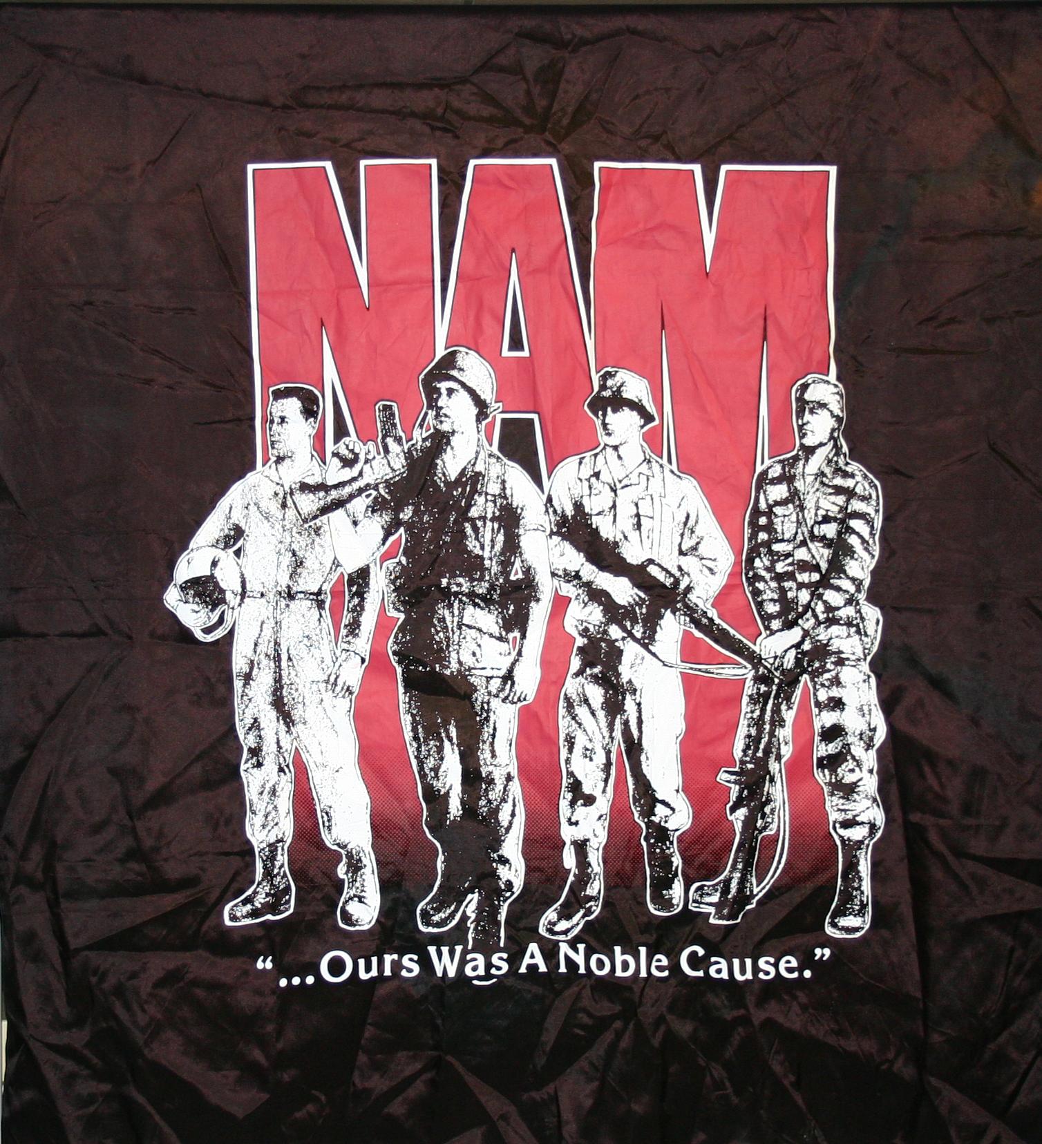 Black banner with four soldiers standing before the word NAM in red block letter. Below is written: '...Ours Was A Noble Cause.'