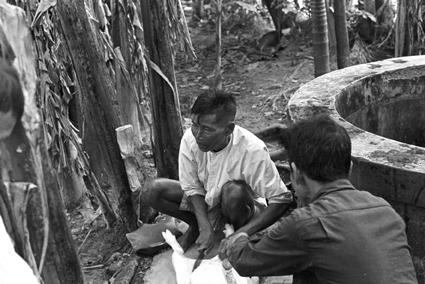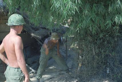 Soldiers with montagnards - G.I. cutting down bamboo trees that were obstructing Tra Bong airstrip