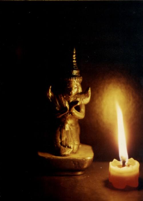 religious small statue sitting next to candle.