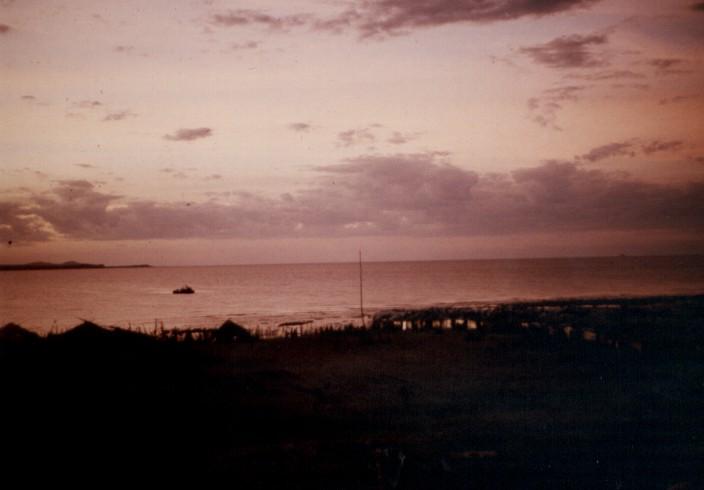evening view of water and structure off the beach.