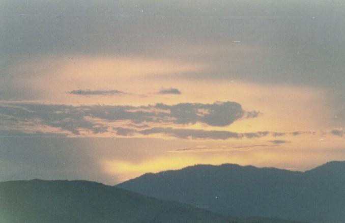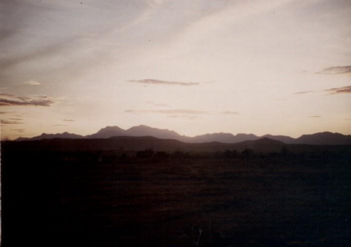 mountains in background, sun in horizon.
