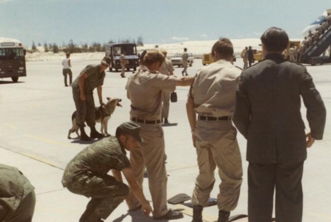 soldiers checking men before entering plane.