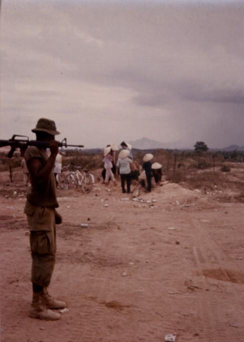 black soldier holding gun, Vietnamese workers in background.