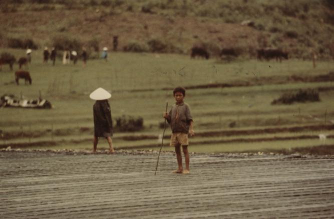 Vietnamese boys riding water buffaloes