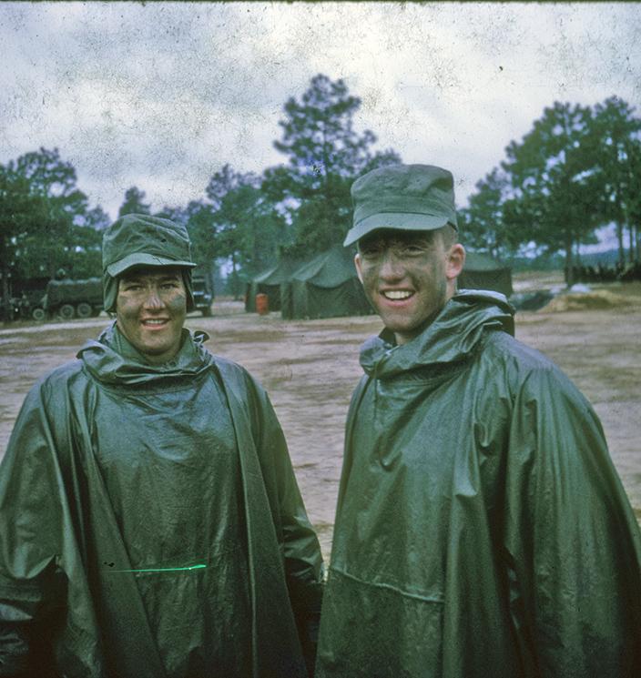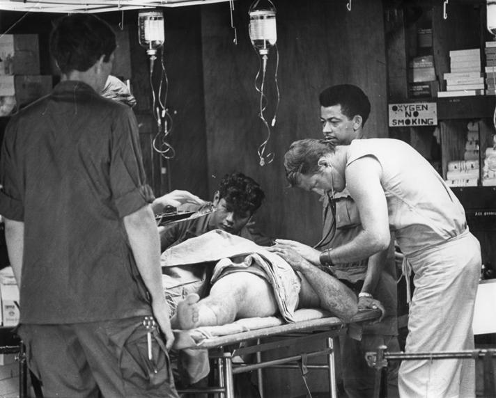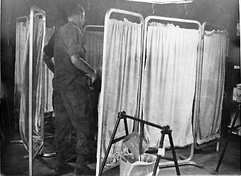 Emergency Room, 91st Evacuation Hospital, Chu Lai, Vietnam. Left to right: unknown back to camera, Dr. Gene Rogers with stethoscope, and Medic Boone.