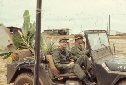 Gardening in Quang Tri. Transplanting banana trees to medical aid station. Medic Priest, driving jeep, and Captain James Evans