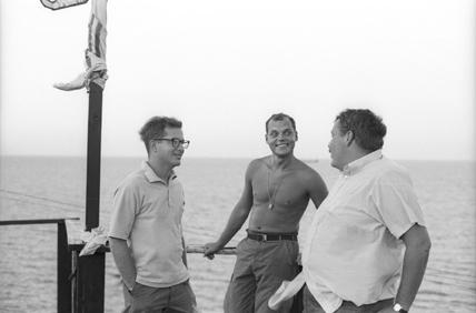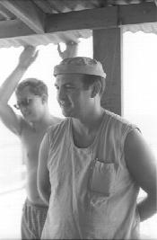 Three doctors on Boys Camp deck, 91st Evacuation Hospital. On left, no shirt, Paul Rodzewicz, center, unknown, right, Galen.