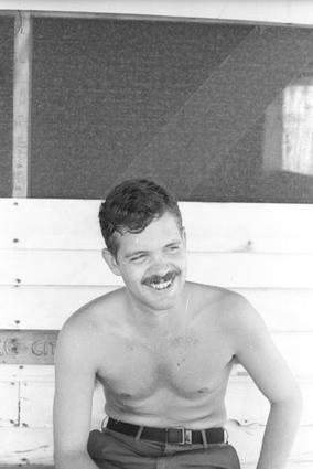 Jim B. Evans on Boys Camp deck, 91st Evacuation Hospital, Chu Lai. Boys Camp flag on left.