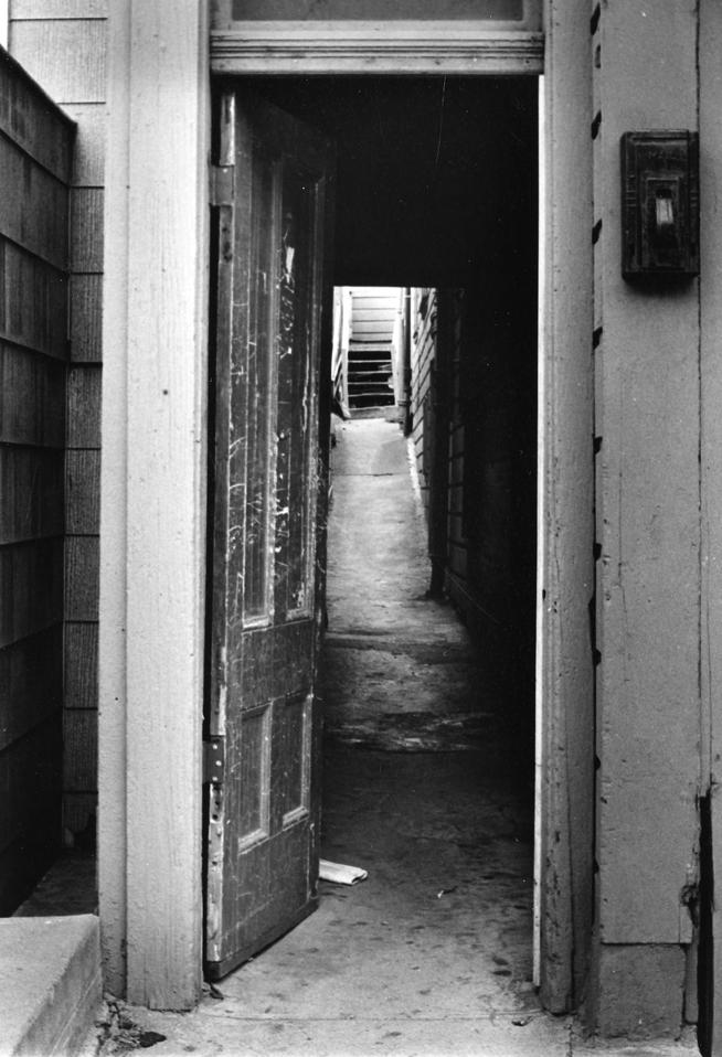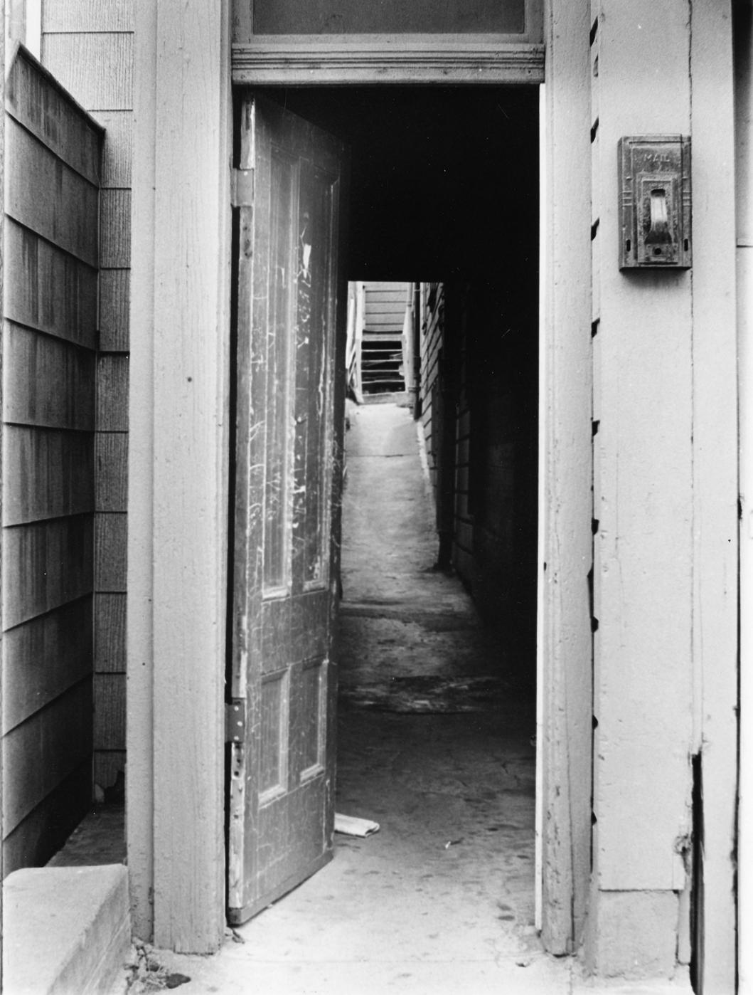 Narrow passageway with mailbox on right. San Francisco near Japanese Trade Center, California.