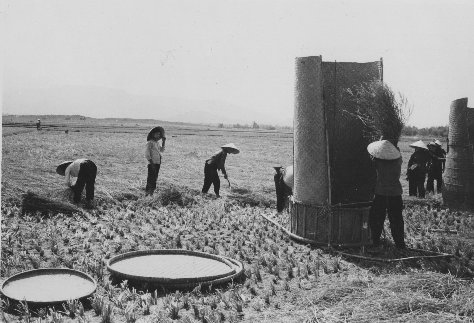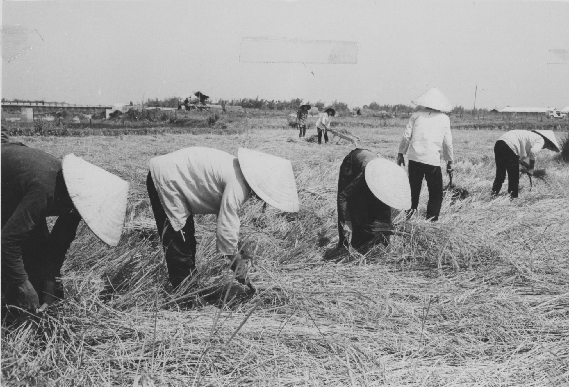 QUANG NGAI (Americal IO)--Vietnamese workers harvest rice in Quang Ngai Province part of the 11th Infantry Brigade, Americal Division area of operation. The Vietnamese are experiencing a bountiful harvest due to stepped up pacification efforts by the Americal, and a new strain of hybird rice.