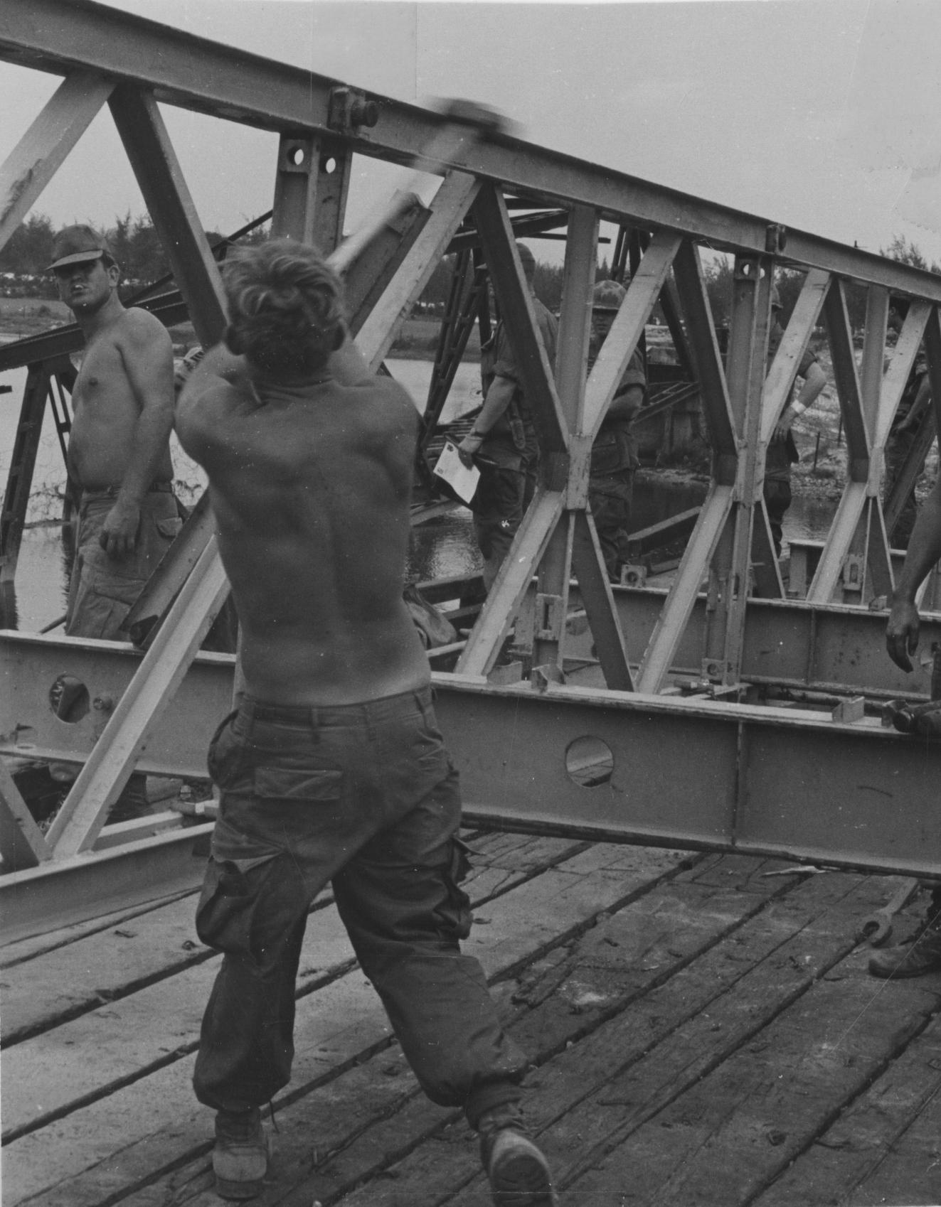 CHU LAI, Vietnam (Americal IO)--The early morning stillness of An Tan village is shattered by the ring of steel on stool. Hammer blows drive a pin into place on the Bailey Bridge constructed by the mon of the 26th Engineer Battalion, Americal Division. Two spans of the original had been blown the night before by Viet Cong sappers.