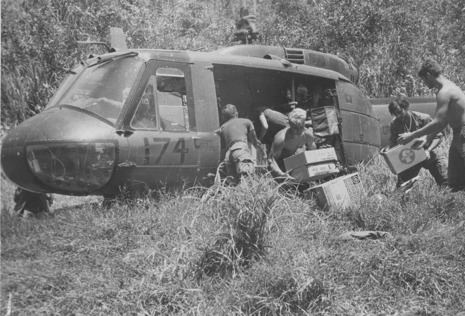 FSB SAN JUAN HILL, Vietnam (Americal IO)--A 174th Aviation Company resupply ship breaks the C-ration routine for 11th Brigade soldiers of the 4th Battalion, 3rd Infantry. Hot chow and still frozen ice cream made the day for the Americal Division soldiers operating 4 miles southwest of Duc Pho.