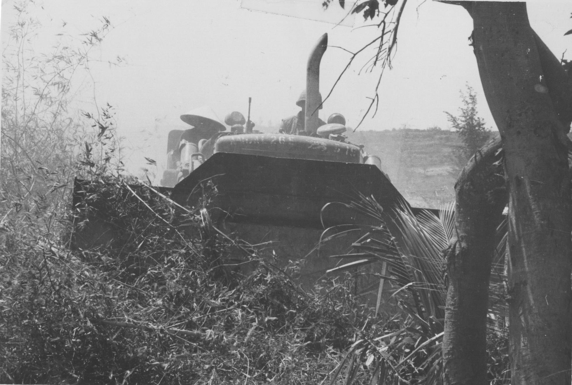 CHU LAI (Americal IO)--A D-7 bulldozer pushes brush and trees before it as it heads for a larger tree. The dozer was involved in the land clearing operation around Van Thien village. It was provided by Hq Plt, B Co., 26 Eng. Bn., Americal Division.